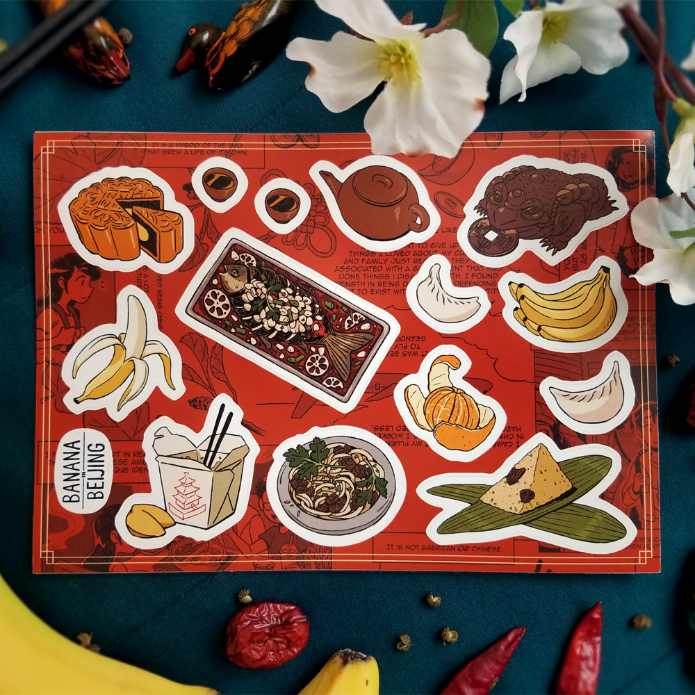 A sticker sheet of familiar foods featured in my autobiographical comic, Banana in Beijing.